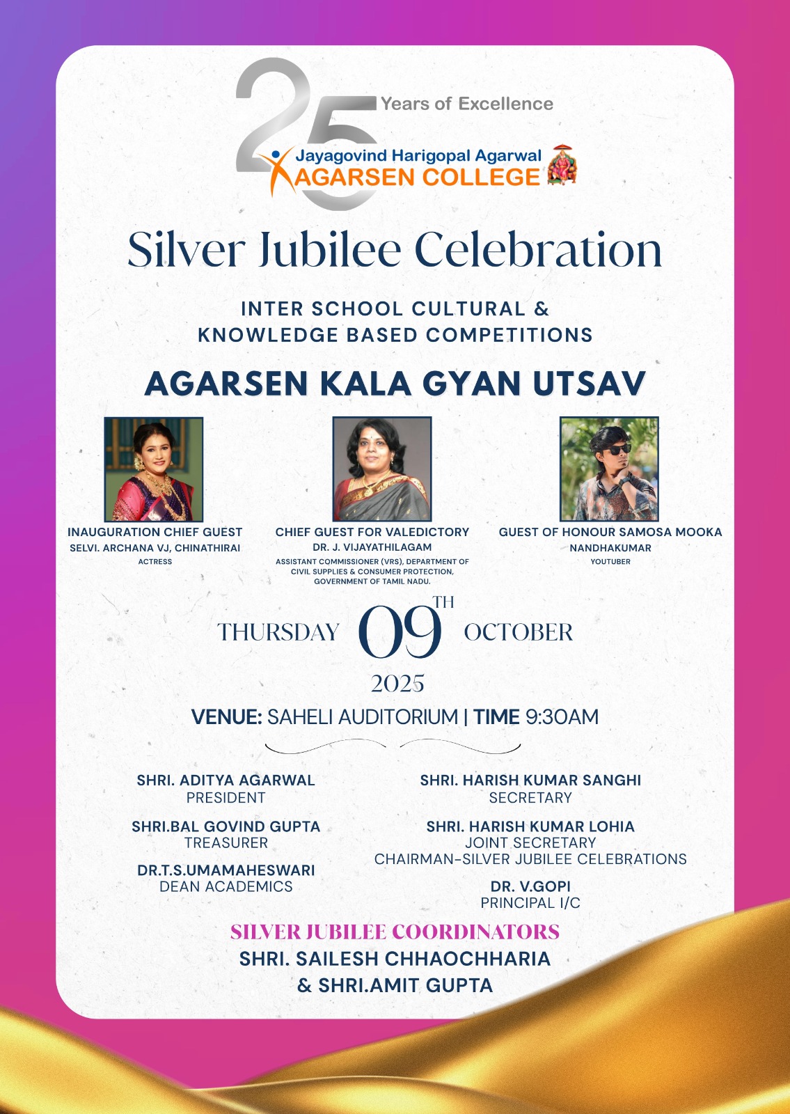 - On behalf of Arya Samaj Foundation, Chennai, we heartily congratulate JHA Agarsen College on the joyous occasion of its 25th Silver Jubilee Anniversary.